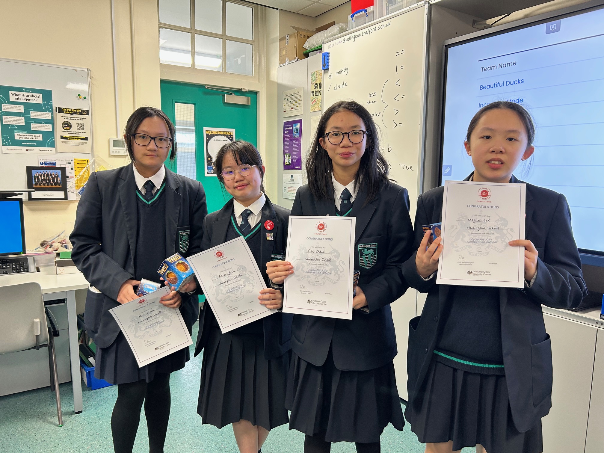 On Monday lunchtime we marked the conclusion of the annual CyberFirst Girls Competition with a little celebration event. All 30 participants were presented with certificates and the final team scores were announced. The winning team from Wellington were ‘Beautiful Ducks’ who scored a whopping 4810 points. Whilst they were not successful in winning the national event and scooping prizes of laptops each, they did bag themselves a chocolate orange and a big round of applause! Well done girls, you were brilliant. I should also mention team ‘Logic Labs’ who came a close second with 4388 points, well done!