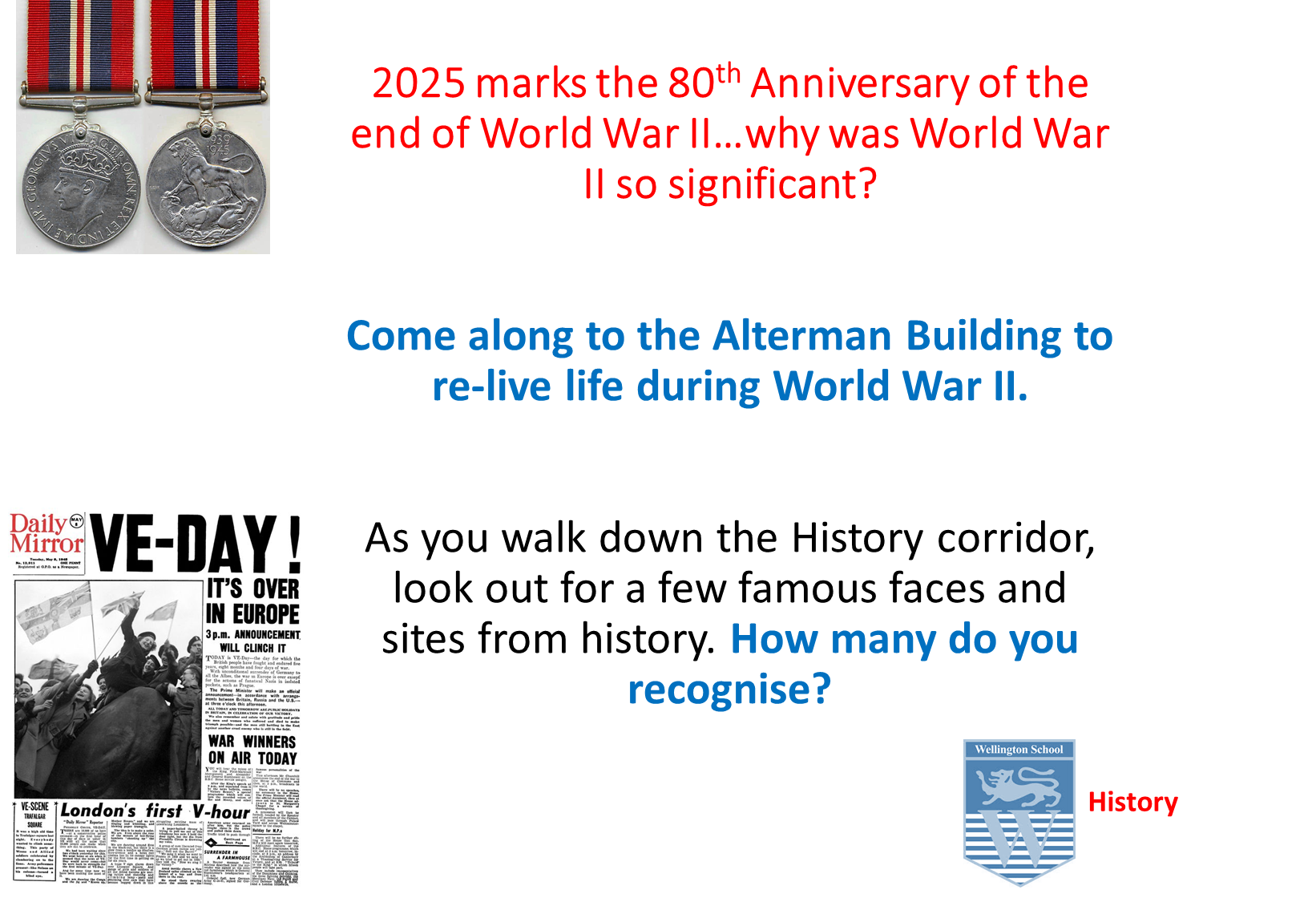 Thank you for visiting the History Department at Wellington School’s recent Open Morning. 2025 marks the 80th Anniversary of the end of World War II and we hope your visit helped to develop your understanding of how Britain was impacted by the war. I am pleased to announce that the winner of our grand prize was Esmé Handby! Congratulations Esmé, we really liked how clearly you labelled your map of the D-Day landing beaches. Please look out for your prize in the post!