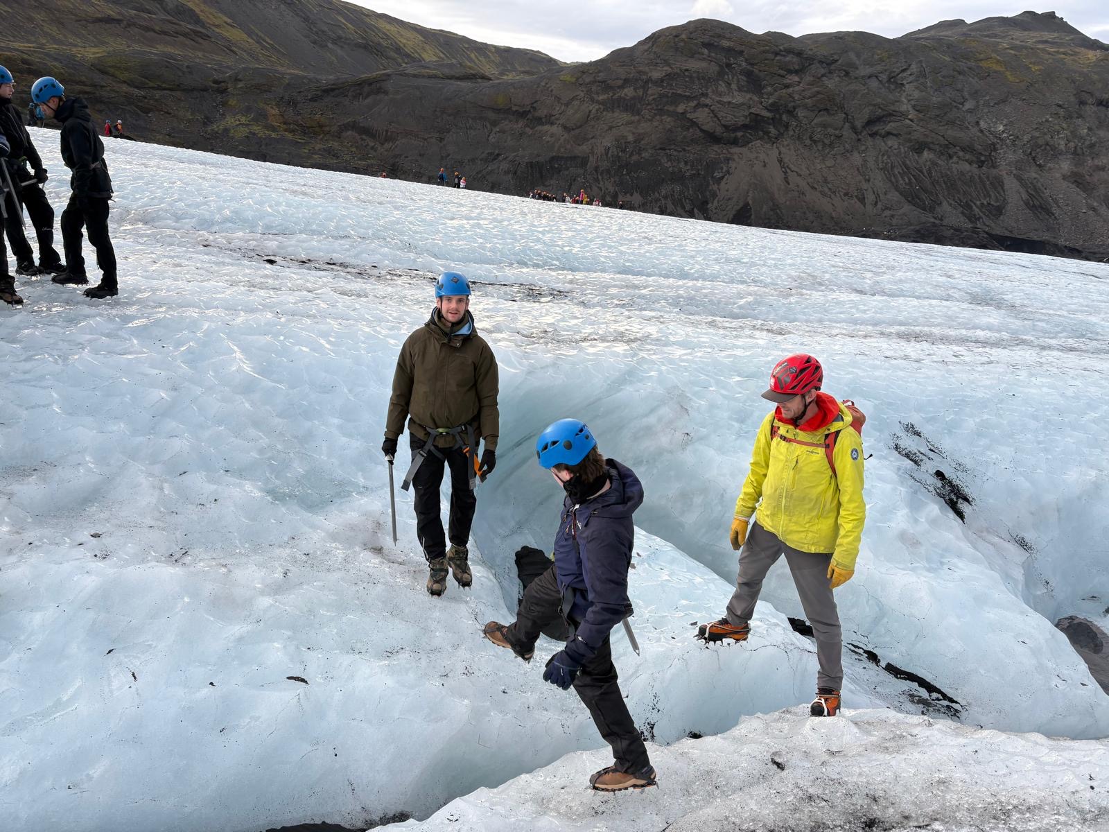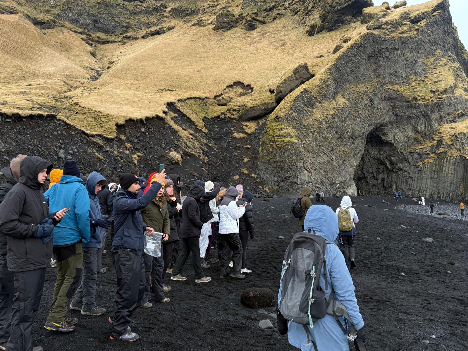 On Monday, the group set off for the Sólheimajökull glacier. Equipped with crampons and ice axes, students experienced what it’s like to walk on a glacier — a real highlight of the trip. We then travelled to Vík beach, known for its powerful sneaker waves and distinctive rock formations created by solidified lava. The students were fascinated by the natural beauty and geological features of the area.