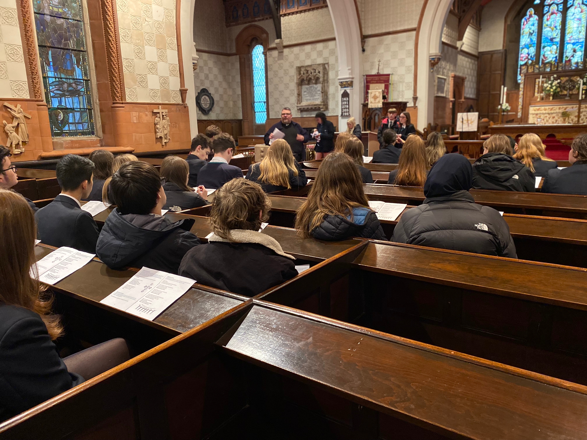 On Thursday, Year 11 full course students accompanied by Mr Brown, Mr Harrison and Miss Hulme went on the short walk to Christ Church where Fr Steve walked them through a mock baptism and communion to help with their full course studies.