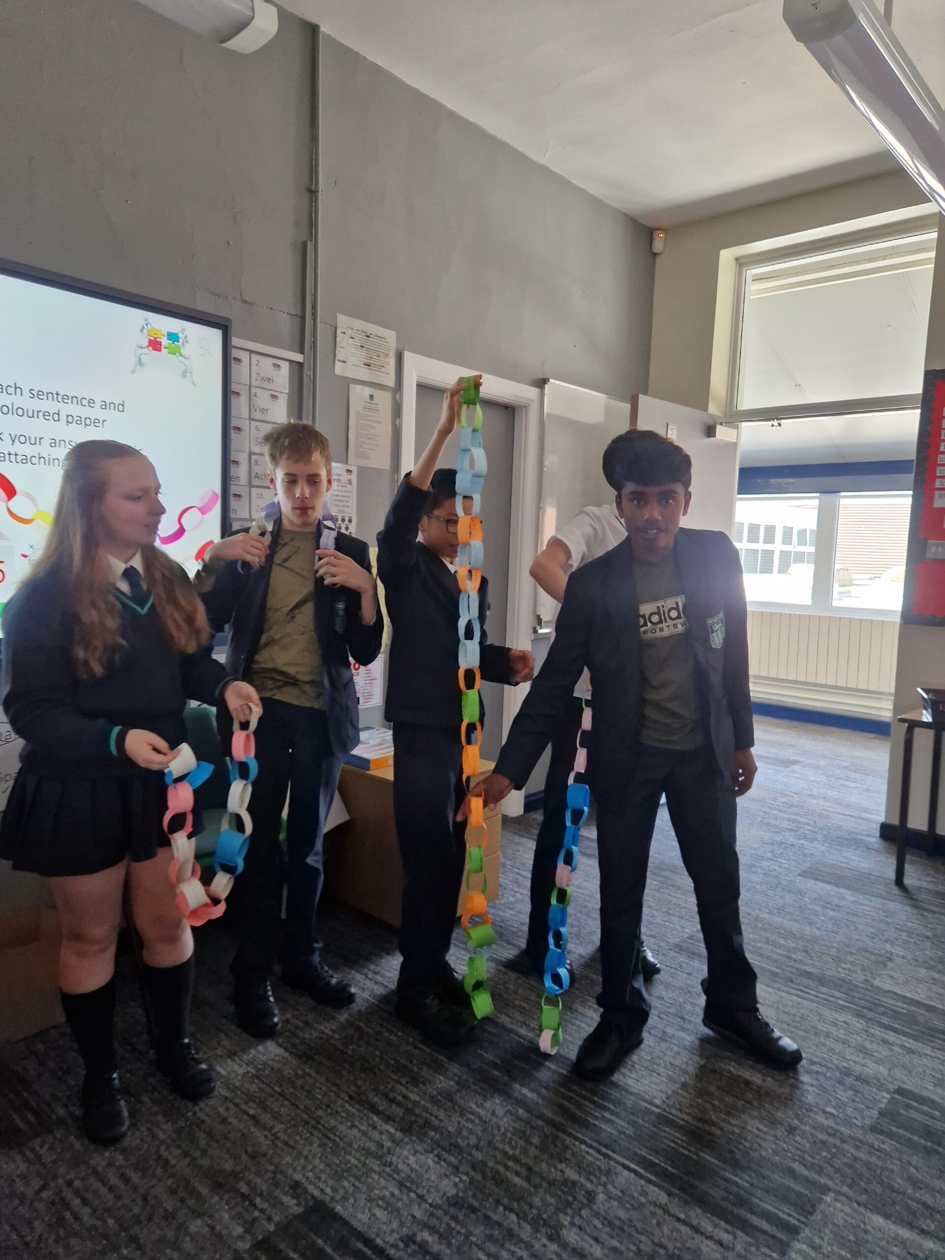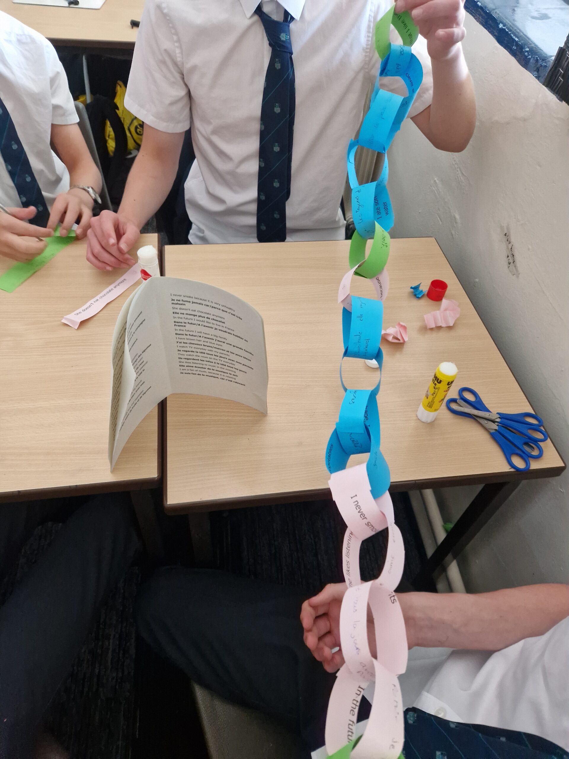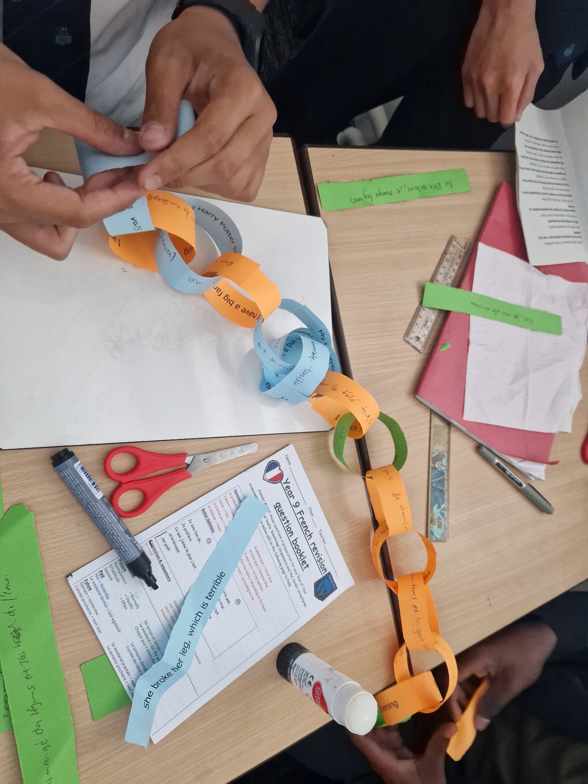 Year 9 French classes have been looking at exam technique and revision skills. My class have revised their grammar and vocabulary to tackle some translation sentences, but with a twist! In teams, they were challenged to create the longest paper chains using their translated sentences. 20 minute time limit and the longest chain wins! Well done to Sourish, Leo, Jaden and Zack for the longest paper chain!